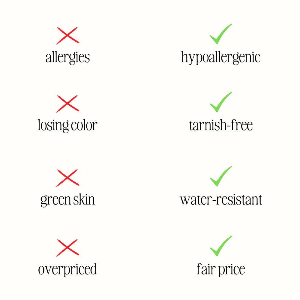 Composición: Acero Inoxidable Premium con Baño de Oro de 18k. Resistente al Agua, Sudor y Calor (Sin decoloración, Sin pérdida de brillo). Hipoalergénico y respetuoso con la piel.